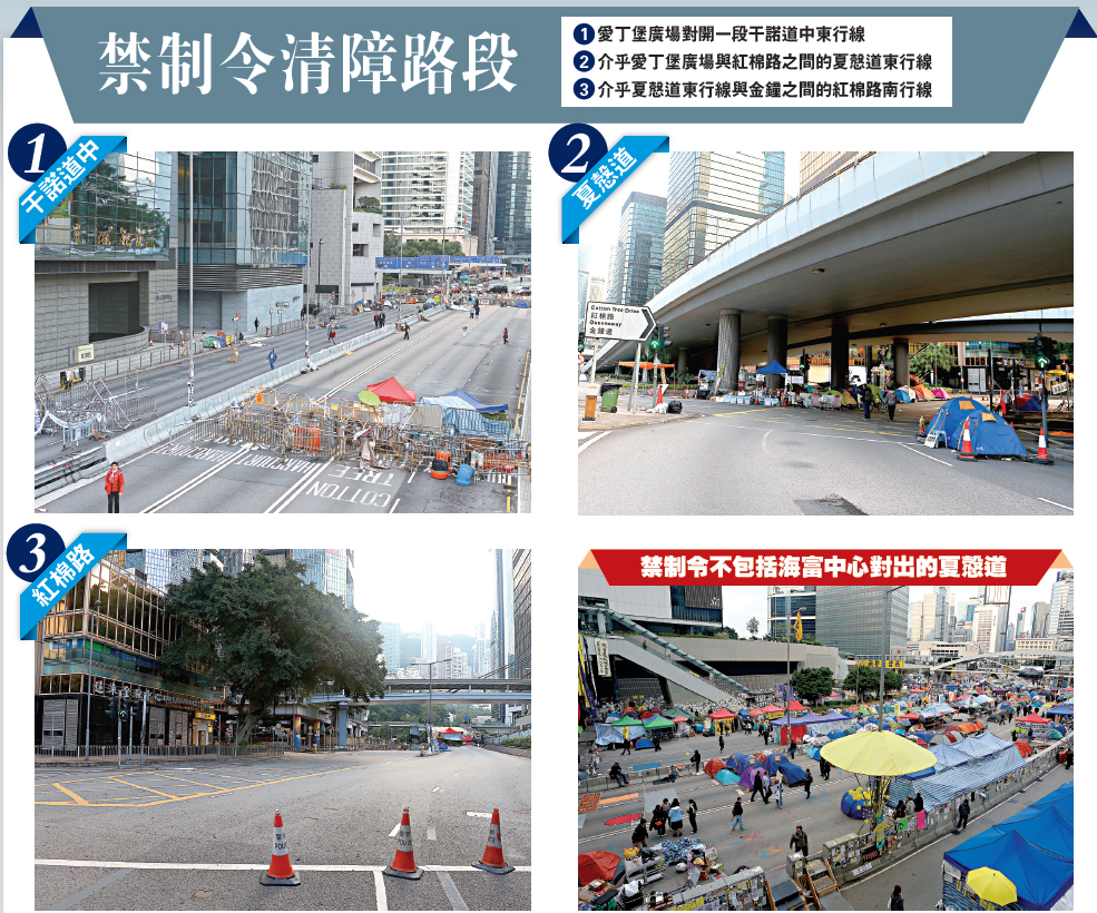 金鐘佔領區昨日大致平靜,寒冷天氣下日間人數稀少,氣氛冷清。金鐘臨時禁制令覆蓋的三處路段設有多個以鐵馬、木板及雜物構成的路障,但只有零星空置的帳篷,及寥寥無幾佔領者。而金鐘佔領區的核心範圍夏?道一帶雖未受禁制令影響,但人數亦不多。