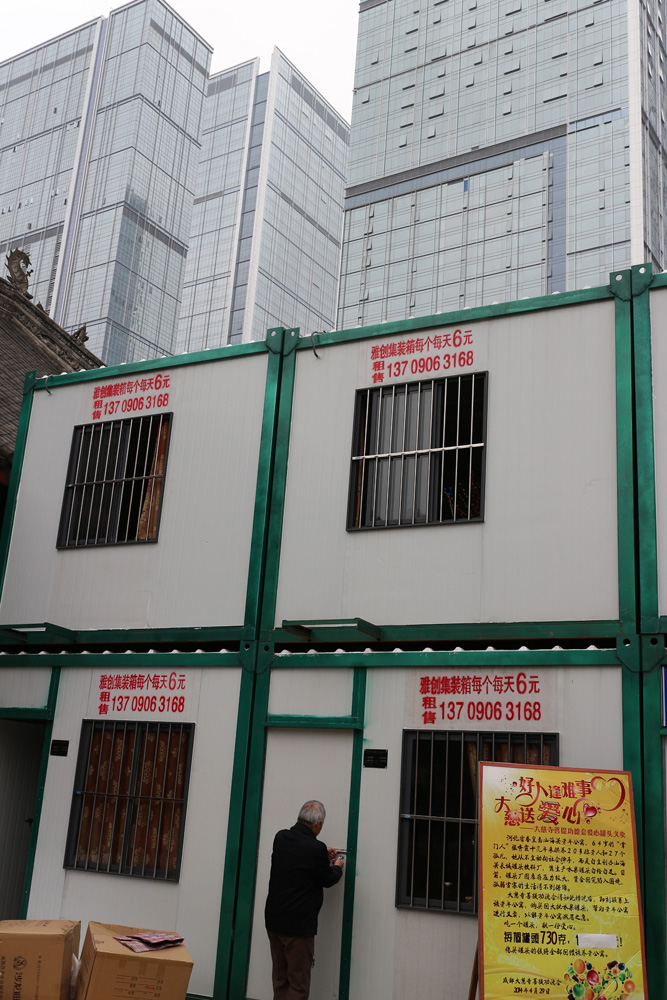 12月5日,成都市核心商業圈春熙路高樓鱗次櫛比。在一棟超過50層的商業樓宇下,一排排集裝箱式的出租房格外顯眼,施工方用每天6元的價格租給外來的建設工人,以提供臨時住宿。
