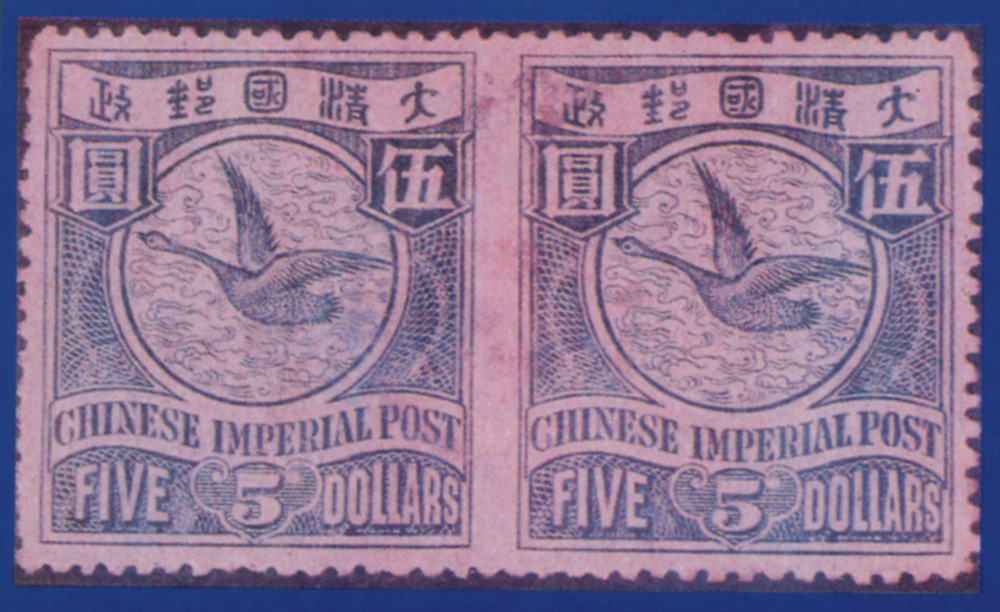 附圖為著名清代《飛雁圖》橫雙連票,刷藍色,面值伍圓,倫敦版,就是十分少有的中縫漏齒錯體票之一。一八九七年石印版《飛雁圖》紅色壹圓方連票,也有中縫漏齒者。筆者早廿多年前,曾見過一新六方連,不但直中縫漏齒,而且橫齒孔稍向上移位,屬打孔雙重錯誤。