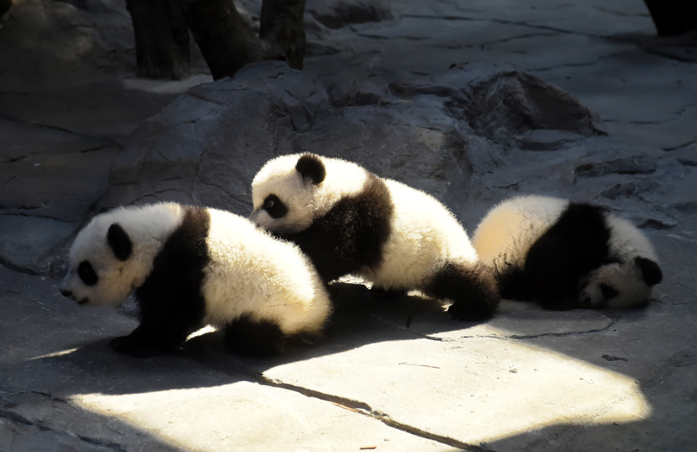 在廣州長隆大熊貓中心,飼養員先將三胞胎幼崽放入館舍內,三個小傢伙隨即展露個性,大姐、二弟相互擁抱打了個滾後就各自散開,玩得不亦樂乎,三弟則倒頭就睡。