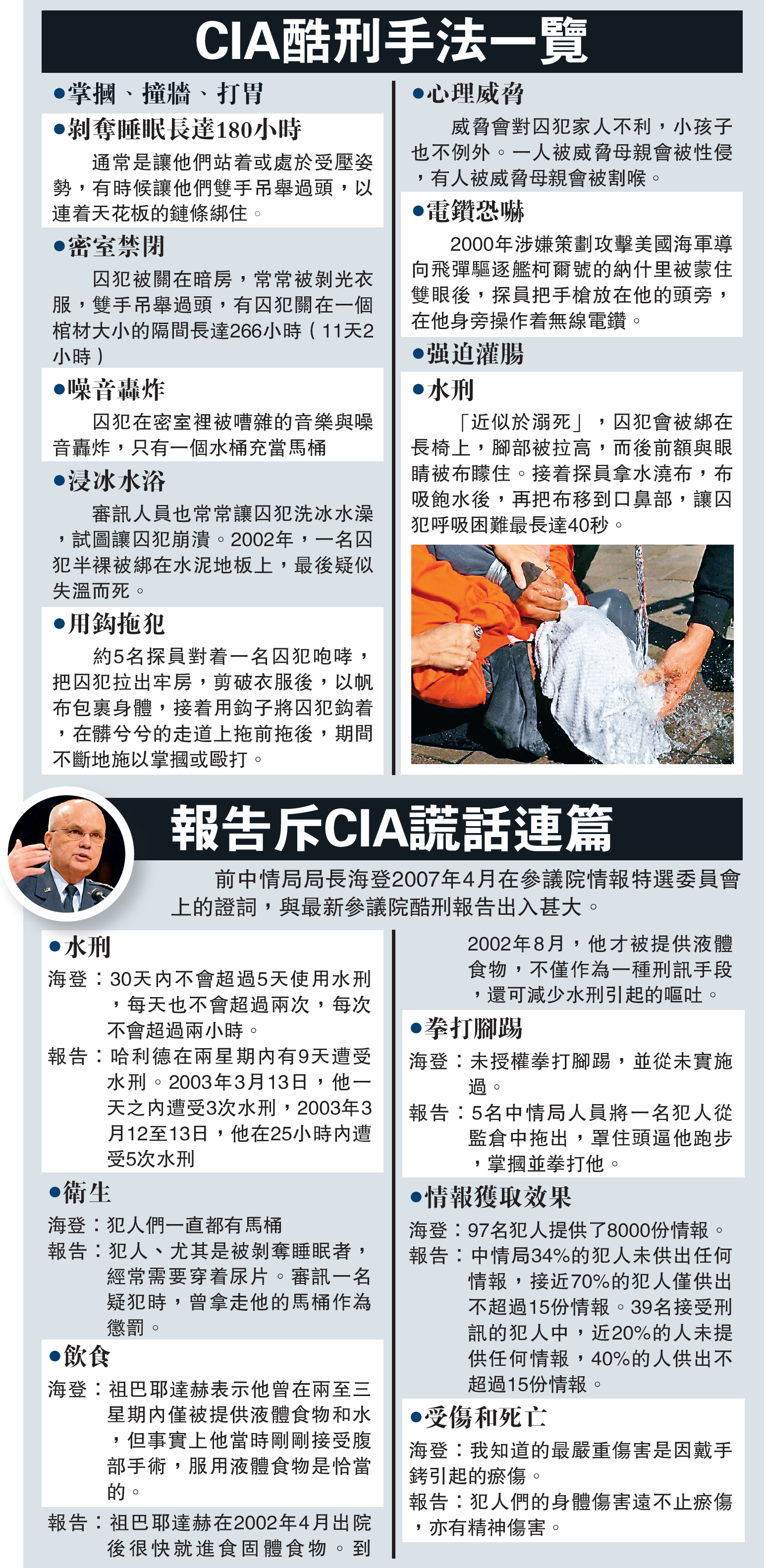 【大公報訊】綜合法新社、路透社、美國《紐約時報》10日消息:美國參議院情報委員會9日正式公開了中央情報局(CIA)酷刑逼供調查報告的摘要,曝光了中情局以反恐之名,實行酷刑虐囚套取情報之實。報告譴責中情局這種嚴刑逼供手法並不奏效,從中所得的情報虛假,無助於阻止美國受到恐怖襲擊,而且殘暴程度遠高於早前向外披露的,而且刻意誤導國會和白宮。美國總統奧巴馬批評中情局的做法,不符合美國價值觀。