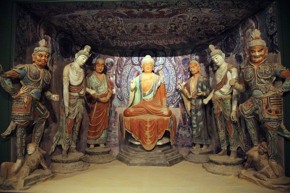在香港文化博物館展出的敦煌展覽,有一組臨摹莫高窟第四十五窟的七尊彩色塑像,造於盛唐年代。中央是結跏趺坐的佛陀,面相莊嚴。左右兩名弟子迦葉和阿難謙恭站立,再外兩旁是婀娜多姿的菩薩,以及威武有力的天王,神態各有不同。各像一字排開,互相對稱,頭部均微微向下,當善信在佛龕前跪拜時,會感覺每尊塑像都凝視?自己。