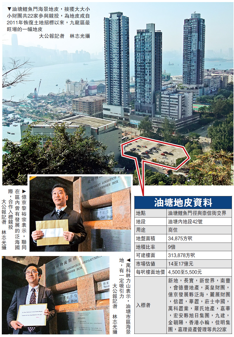 □海景有價,地皮受追捧市場,繼馬鞍山海景地後,油塘海景商住地又被一眾發展商圍搶,政府昨日接獲22家財團以獨資或合資方式入標逐鹿,彼此均眾口一詞聲稱此是難得一見的市區臨海地,出價會較為進取。/大公報記者 林志光
