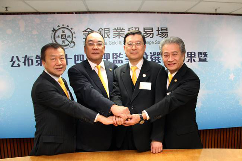 金銀業貿易場第44屆理監事會選舉昨日圓滿結束,平和國際集團董事陳尚智,以高票當選新一任金銀業貿易場理事長。他表示,未來兩年將與其他三位首長,一同為金銀業貿易場於前海的項目,以及與上海黃金交易所聯合建立的「黃金港滬通」繼續努力。他指出,「黃金港滬通」與推行近一個月的「滬港通」性質不同,不能比較,並對「黃金港滬通」的前景十分有信心。圖為金銀業貿易場新一屆理監事會首長分別為理事長陳尚智(左二),副理事長鄭錦標(右二)、謝滿全(左一)及監事長張德熙。