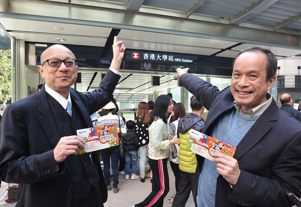 圖:張炳強(左)與歷史學家鄭寶鴻,率傳媒參觀港鐵西港島線香港大學站