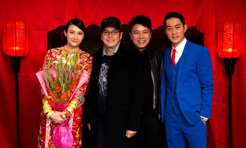 圖:黃伊汶(左)與陳國坤(右)補擺婚宴,阿倫(左二)和克勤到賀