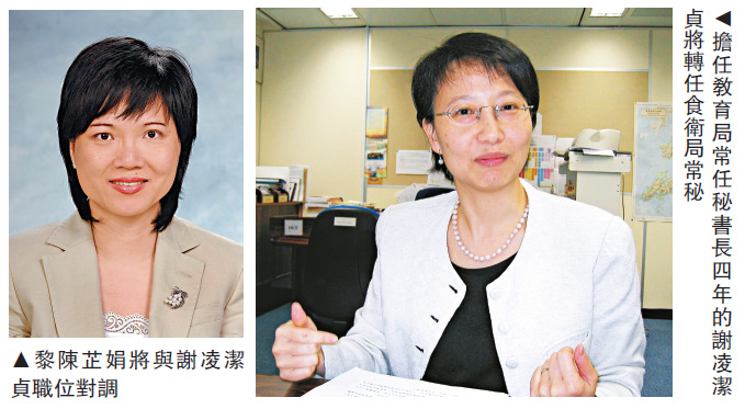 【大公報訊】記者劉家莉、呂少群報道:政府昨日公布新一輪高層官員調動,擔任教育局常任秘書長四年的謝凌潔貞,將與食物及衛生局常任秘書長(食物)黎陳芷娟職位對調,明年1月19日生效。教育局局長吳克儉讚揚謝太處事認真、專業,感謝她多年來為香港教育所作的貢獻。教聯會會長黃均瑜認同是次調動是正常安排,他稱讚謝太是教育有心人,希望她將重整直資制度的魄力用在新部門食物安全的把關上。學界普遍希望新常秘盡快熟悉教育以作出良好決策。