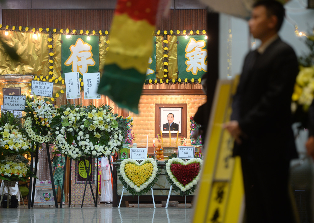 圖:殉職消防總隊目梁國基靈堂中央掛有「浩氣長存」輓聯