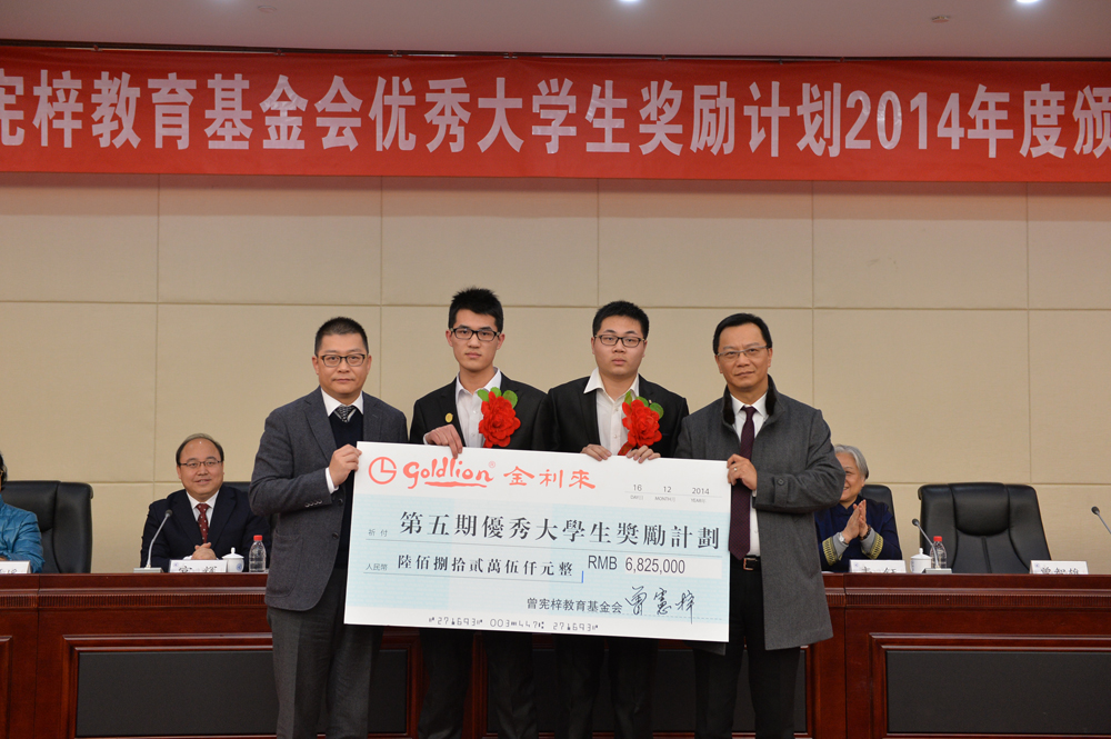 【大公報訊】曾憲梓教育基金會優秀大學生獎勵計劃二○一四年度優秀大學生頒獎大會於十二月十六日在西安舉行。來自內地38所高校的1365名優秀大學生獲得總額人民幣682.5萬元的獎勵。