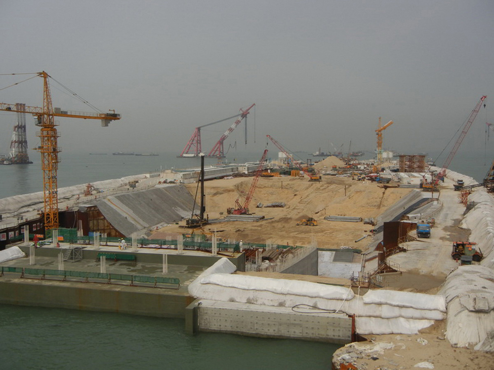 圖:港珠澳大橋工程證實超支18%,造價升至358.9億元。圖為人工島施工場景