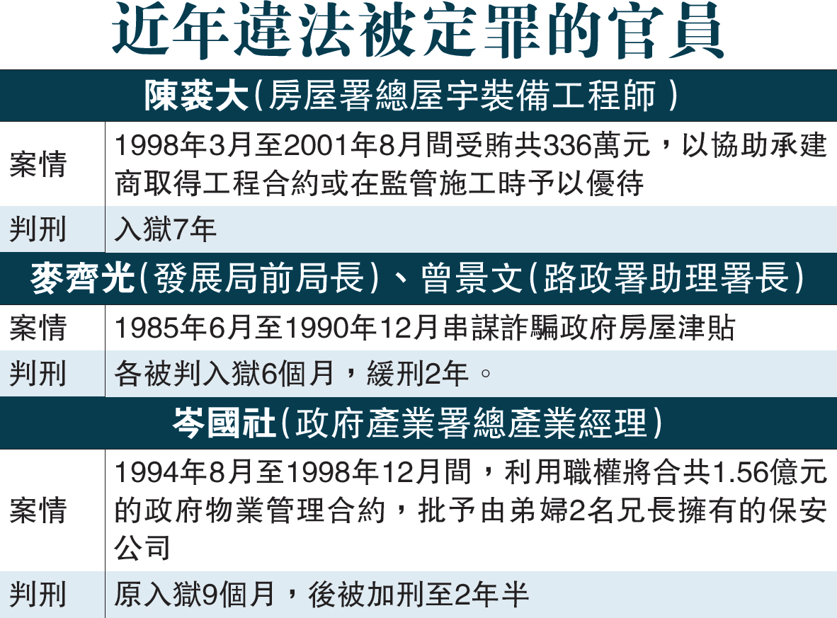 港府在上世紀70年代為求肅貪,推行「高薪養廉」概念,官員享有高薪厚祿。回歸後,先後有梁展文、許仕仁、麥齊光、曾景文、湯顯明等政府或公職人員,被揭發行為不當,涉嫌官商勾結或貪污,當中以前政務司司長許仕仁官職最高、涉案金額至鉅。