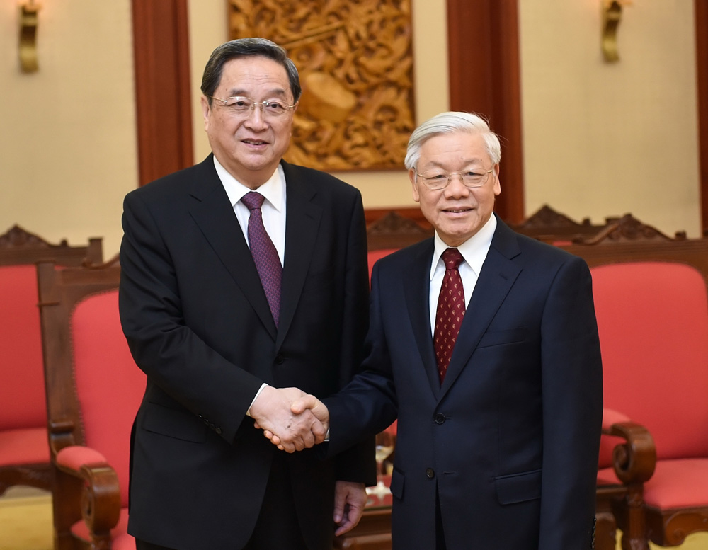 俞正聲表示,中越是近鄰,都是共產黨領導的社會主義國家,兩黨高層交往對雙邊關係發展具有不可替代的重要作用。面對當前複雜多變的國際和地區形勢,雙方領導人要把握好友好合作的主基調:一是要加強互信、增進共識。兩國政治制度相同,理想信念相通,發展道路相近,前途命運相關,維護和發展社會主義符合兩國人民的共同利益,也是雙邊友好合作的政治基礎。二是要加強輿論引導,妥善處理海上問題。海上問題高度複雜敏感,要靠協商對話管控分歧和矛盾,隔空喊話只會引發民意波動,雙方應全力避免。三是要推動各領域務實合作,實現共同發展。我們願同越方加強溝通,推動合作機制建設,辦好建交65周年紀念活動,為中越關係發展夯實民意基礎。