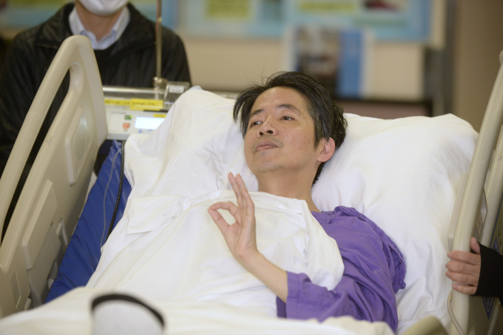 □遇襲受傷的《明報》前總編輯劉進圖情況進一步好轉,昨日已轉到私家病房留醫,並向傳媒展示「OK」手勢。劉進圖妻子陪同丈夫離開深切治療部時表示,丈夫的傷勢嚴重,復康療程將會非常漫長,但家人有信心面對,並多謝各界支持和關心,以及警方全力追捕兇徒。\大公報記者 區天海