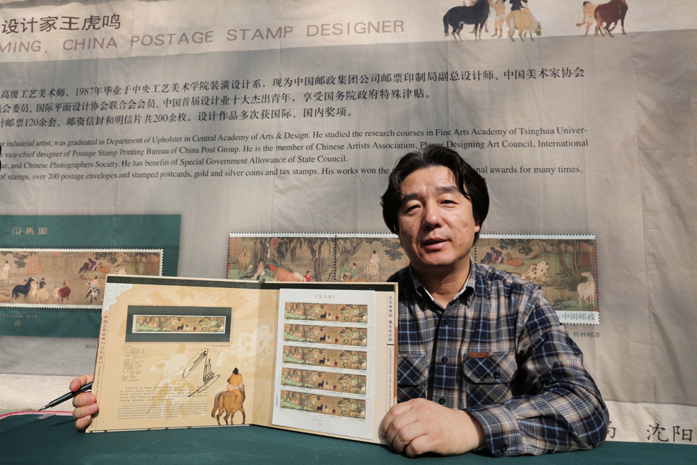 圖:王虎鳴展示其設計的郵票《浴馬圖》\本報攝