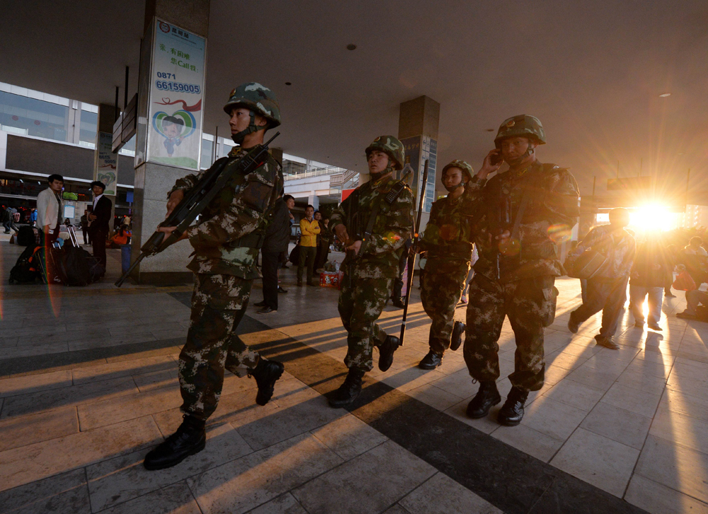 昆明安保升級,昆明火車站派出所為站崗的警察都配備了槍支。據知情人士介紹,「因為車站和火車都是人群密集的『窗口』單位,對槍支管理很嚴格,一般情況鐵警都沒有配備槍支。」