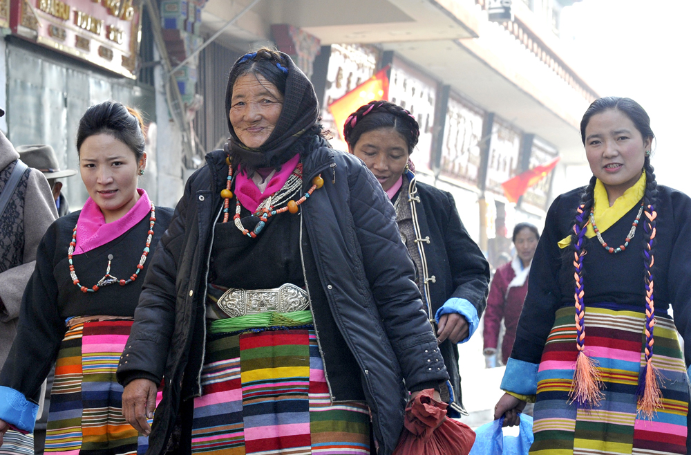 圖:3月2日是藏曆大年初一,圖為身?民族盛裝的藏族婦女在拉薩街頭走親訪友\中新社