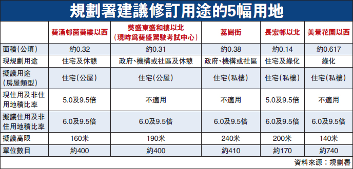 上述5幅用地均未列入下年度賣地計劃,規劃署將就改劃建議諮詢葵青區議會。
