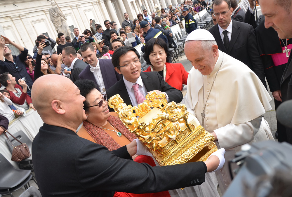 圖:教皇方濟各接受陳麗華女士贈送的貼金雕龍寶座