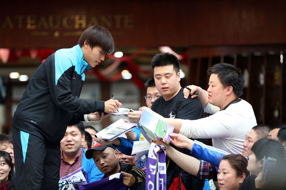 球迷見面會上,球迷們裡三層外三層的將中澤將士圍在其中,爭相索要簽名、合影。方?倫擁有超高人氣,有球迷特意為其而來,簽名、合影、要電話號碼等,方?倫一一滿足球迷要求。