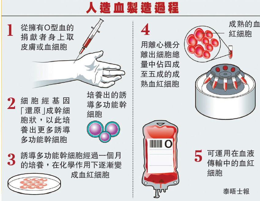 蘇格蘭國家血液服務中心醫療總監特納(Marc Turner)領導的研究團隊,花了幾年時間,投資500萬英鎊,透過「經誘導產生的萬能幹細胞」(induced pluripotent stem cells,簡稱iPS)培養出血紅細胞。目前人造血紅細胞的培養過程需時約一個月,成功率已可達4至5成。特納說:「這是人類首次製造出適合用於人體的血紅細胞,史無前例。」