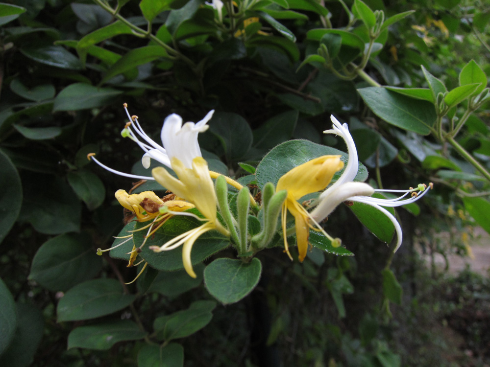 忍冬科多年生半常綠纏繞木質藤本,莖中空,多分枝。葉對生,紙質,葉片卵形、長圓狀卵形或卵狀披針形,先端短尖,基部圓形或近心形,全緣。花成對腋生,苞片葉狀,花初開時色白,2-3天後轉成黃色,因而得名「金銀花」。莖、葉、花密被短柔毛。漿果球形,成熟時藍黑色,有光澤。藥用花蕾。味甘,性寒,功能清熱解毒,主治溫病發熱,熱毒血痢,癰腫疔瘡,喉痹等。