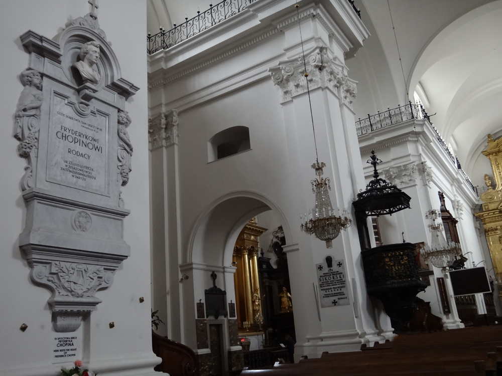 居里夫人還是少女瑪麗時,曾嚮往入讀華沙大學,只是家裡太窮才改往巴黎投奔她的大姐。華沙大學面積不大,但布局嚴密,建築小巧,環境清雅。大門馬路的左前方是聖十字架大教堂,進去左邊的一方大柱上掛?有蕭邦頭像的石碑,蕭邦的心臟便埋在了那柱子下面。在二戰時,教堂有三分之一被摧毀,人們把蕭邦的心臟取出來,直到戰後一九四五年重新隆重下葬。遊客來自世界各地,人們都在大方柱下獻花,在周圍靜坐流連,彷彿能感受到音樂家的氣息和心跳。蕭邦告訴我們:音樂的影響沒有國界,然而音樂家有他的祖國。