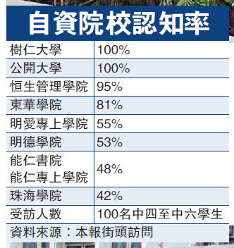 為了解高中生對各自資院校的認知程度,本報於復活節期間以問卷形式抽樣訪問100名中四至中六學生,問卷列出公大及能仁專上學院、珠海學院、明德學院、東華學院、樹仁大學、恒生管理學院、明愛專上學院共七間以320章註冊的自資院校的校徽及校名,詢問受訪者有否聽過上述院校之名。結果發現,仁大及公大錄得100%「認知率」,反映該兩間掛有大學牌頭的院校在高中生心中甚具名氣。緊隨其後的恒管則有95%受訪學生表示曾聽聞其名。