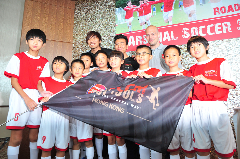 圖:龍格堡(後排右一)授旗予阿仙奴(香港)足球學校的小球員\本報攝