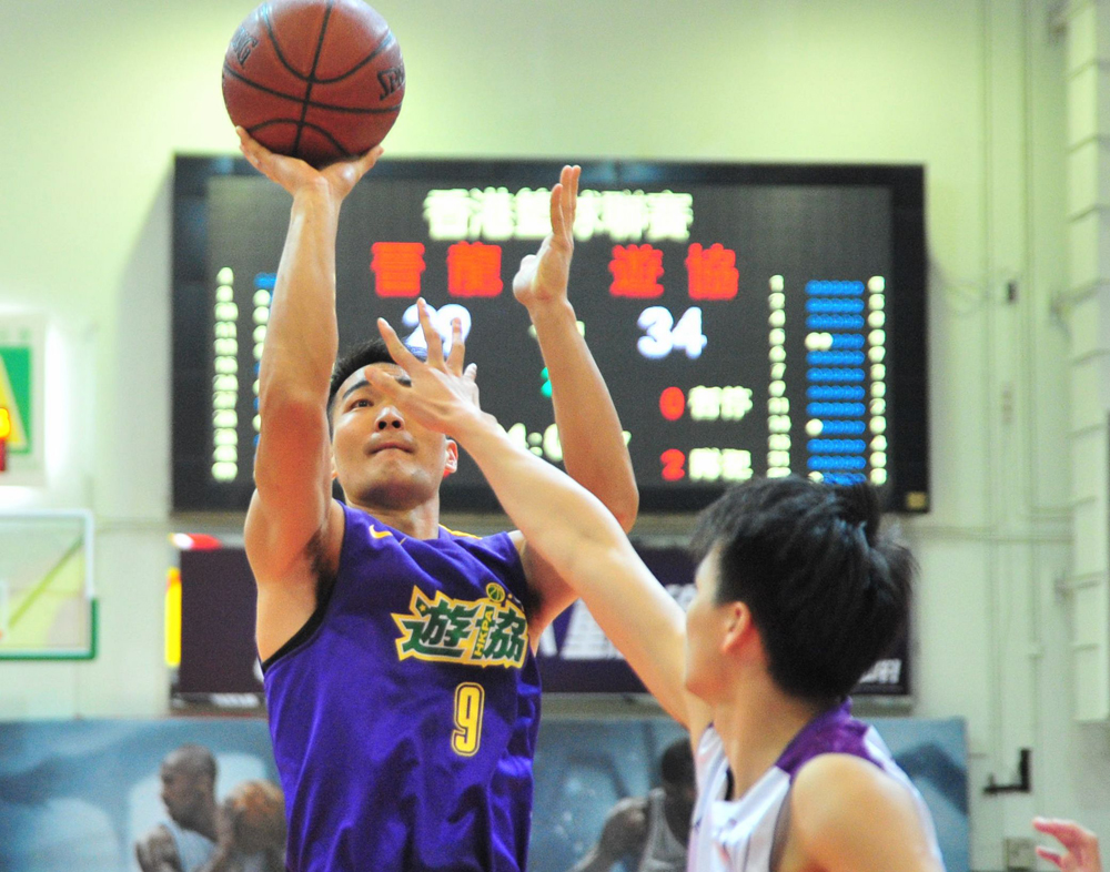圖:遊協球員余永興(左)在完場前4分鐘射入重要的3分球\本報攝