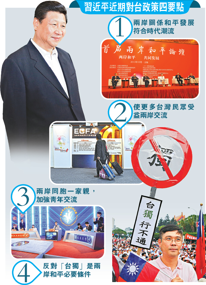 □對於中共中央總書記習近平提出的大陸對台政策「四個不會」原則,國台辦發言人馬曉光14日在國台辦例行新聞發布會上表示,習總書記的講話面向廣大台灣同胞,表明了大陸對台工作的基本方針政策。馬曉光還指出,兩岸經濟合作互利雙贏,不存在「誰擺布誰、誰吃掉誰」的問題。