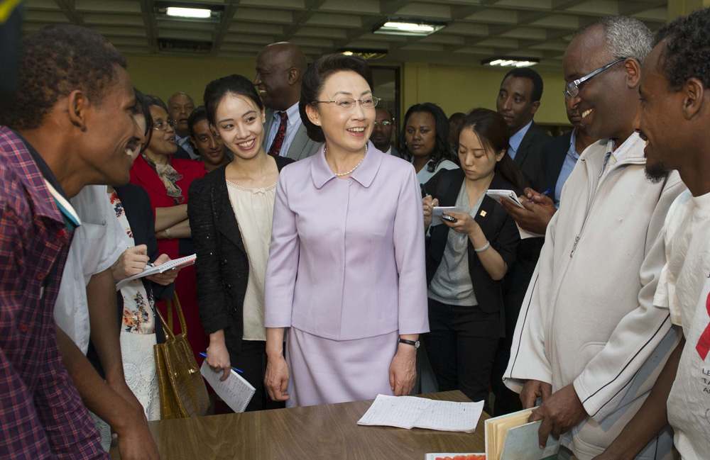 圖:5月5日,李克強總理夫人程虹參觀亞的斯亞貝巴大學,觀摩漢語授課,與學生們交流,觀看學生們的中國文化才藝展示。
