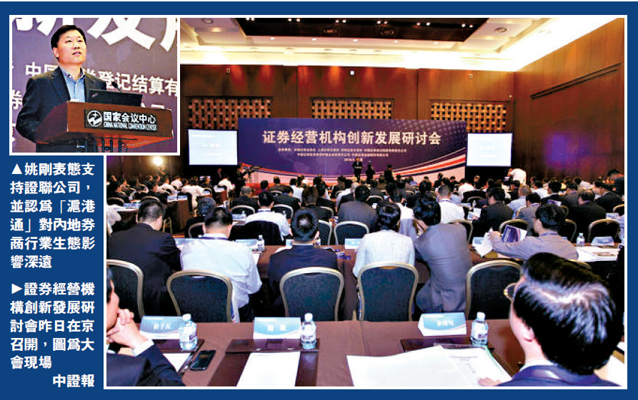 □2014年證券經營機構創新發展研討會昨日在北京召開。中國證監會副主席姚剛在會上肯定了「證聯公司」的價值,認為券商未來可通過互聯網平台改造現有業務;同時對「滬港通」表示高度評價,認為可將對內地券商行業生態產生深遠影響。/大公報記者 李靈修
