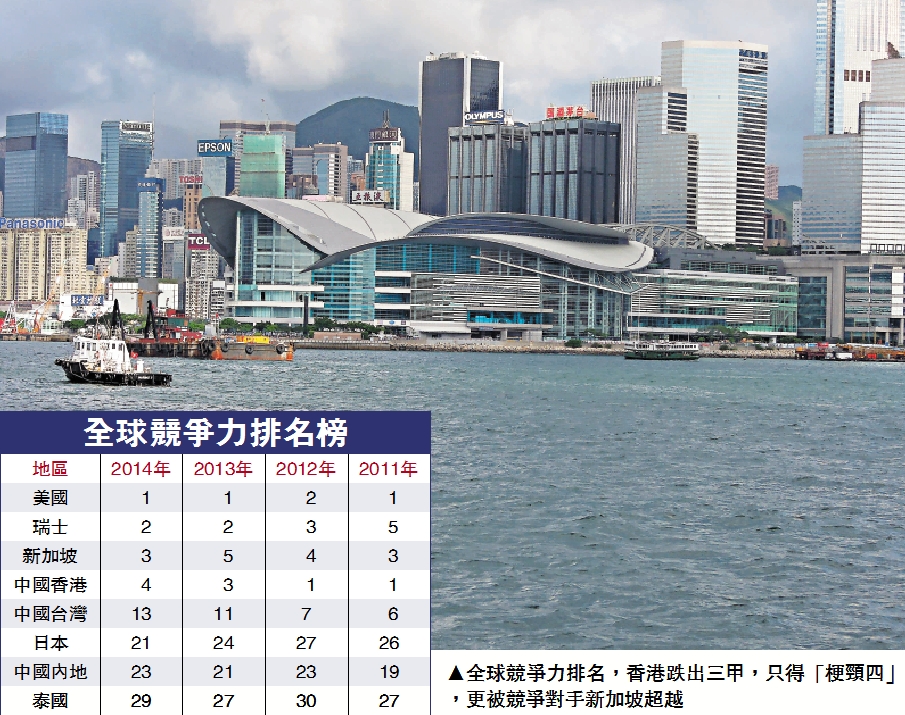 瑞士洛桑管理學院昨日公布的《2014年全球競爭力年度報告》,作為亞洲金融中心的香港,繼2013年失去冠軍寶座之後,今年再跌至「梗頸四」;而其主要競爭對手新加坡,則成功擺脫頹勢,連跌三年後終反彈兩格。