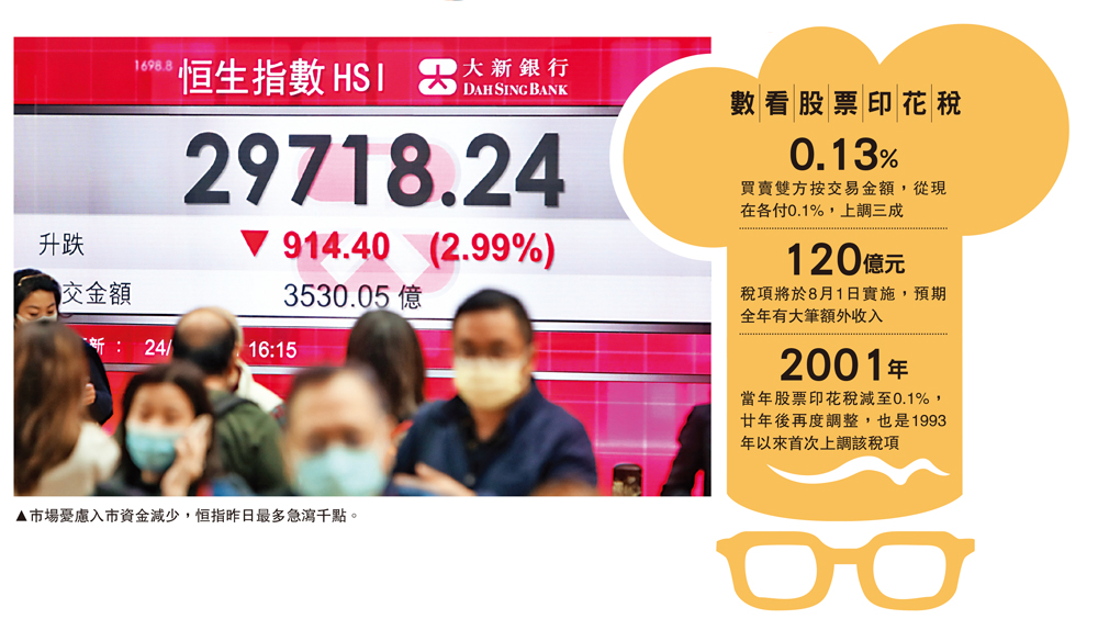 為增加政府收入,財政司司長陳茂波在《財政預算案》中,建議調高股票印花稅,由現時買方或賣方各付0.1%稅率,上調至0.13%。消息稱,新印花稅率有望在8月1日實施。政府加稅,恒指昨日最多急瀉逾千點,主板交投3530億元,再破歷史紀錄。陳茂波表示,港股出現調整,區內其他市場亦有調整,幅度與港股相若,當局會密切留意加稅對庫房收入及股市影響。