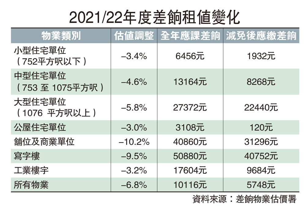 【大公報訊】記者曾敏捷報道:疫情重挫本港經濟,物業租值亦迅速下滑。差餉物業估價署重估全港物業單位差餉租值,各類物業應課差餉租值平均下跌6.8%。十大藍籌屋苑全線錄得降幅,黃埔花園、沙田第一城跌幅更高達6%;非住宅單位的租值更插水大跌,大跌逾一成,其中舖位及商業單位最慘烈,降幅達到10.2%。經濟前景不明朗,財政預算案「派糖」150億元,寬減住宅及非住宅物業全年差餉,料可惠及338萬個各類物業業主。