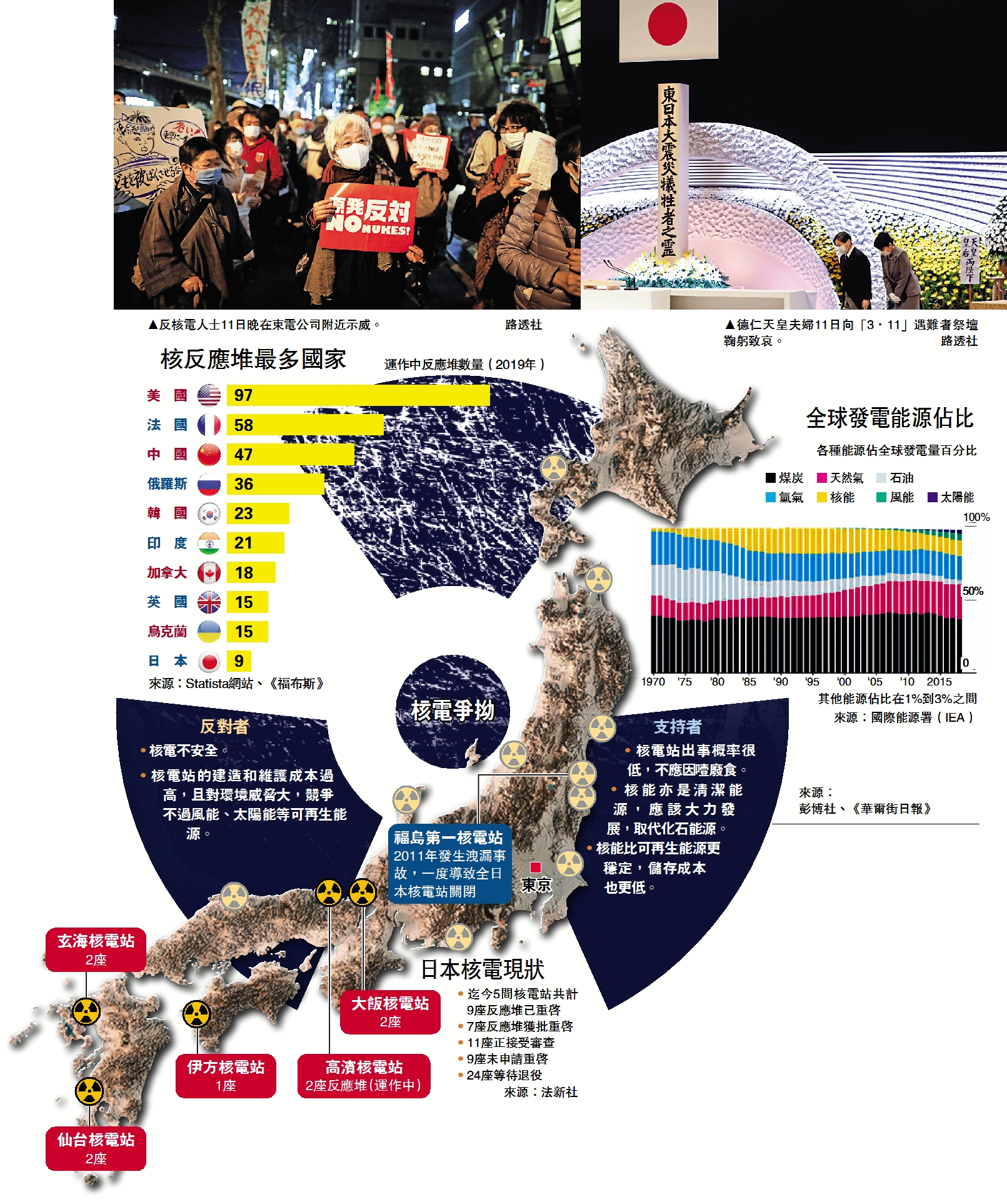 【大公報訊】綜合共同社、法新社、彭博社報道:當地時間11日,日本官方和民間均舉行「3.11」大地震十周年悼念儀式,為2.2萬在地震、海嘯、核洩漏三重災難中死亡或失蹤的人口默哀。與此同時,為實現減排目標,日本有意重啟所有在福島核災後關閉的核電站。然而,日本政府耗費10年都未能妥善處理洩漏事故,令民眾對其核電政策產生懷疑。