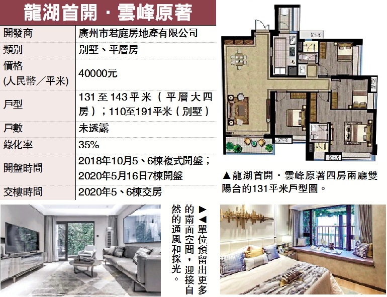 龍湖首開.雲峰原著是建在半山的生態別墅區,樓盤位於廣州黃埔區科學城永和大道轉雲峰路附近。銷售中介告訴《大公報》記者,項目位置環境清幽,交通便利,大面積的豪宅配置,適合在科學城經營生意的港商置業自住。項目佔地面積約13.5萬平米,建築面積約46萬平米,容積率僅2.8,共規劃332套珍稀別墅席位、8棟高層住宅,在園林方面打造了層次感豐富的「五重園林景觀體系」。