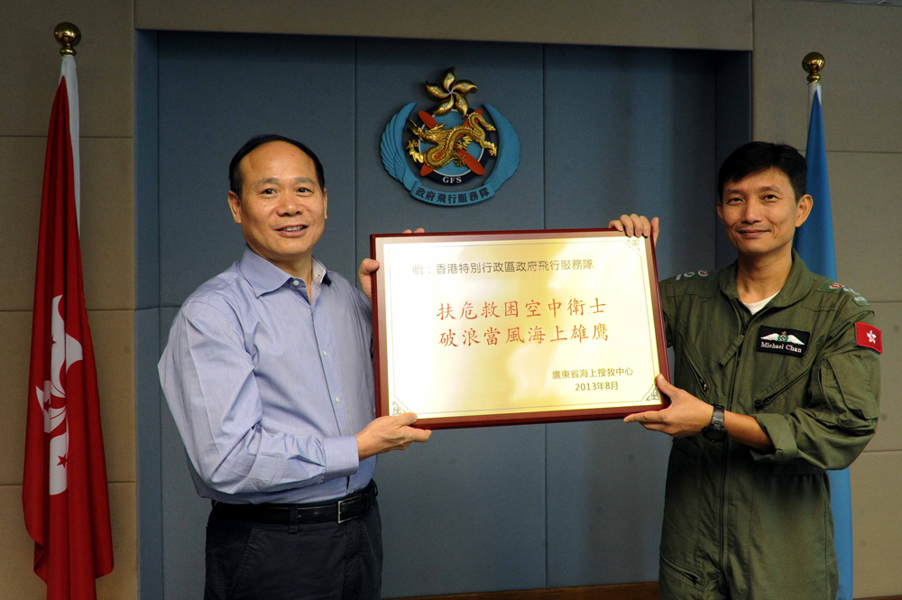 圖:兩名飛行服務隊隊員去年在颱風尤特襲港時拯救沉船船員獲頒銀英勇勳章,圖為廣東海事局向飛行服務隊致送牌匾 資料圖片
