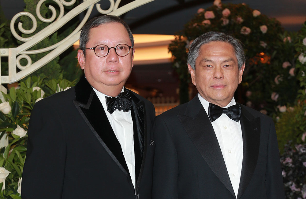 圖:何柱國(右)今年喜事重重,除獲大紫荊星章外,其兒子於年初與林建岳女兒結婚,圖為何柱國與姻親林建岳合照 資料圖片