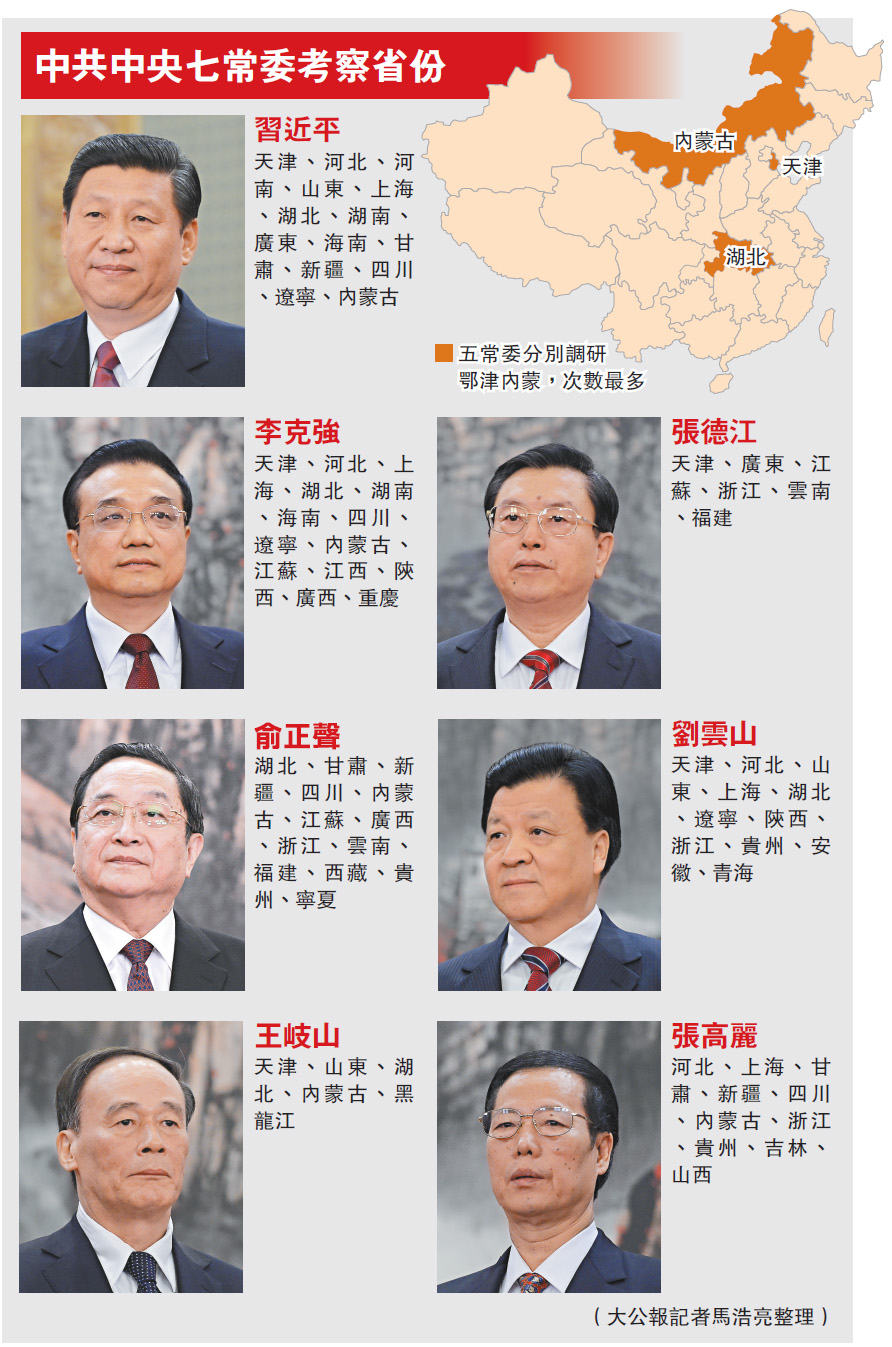 從京外省份來看,習近平和李克強各去過14個,俞正聲、劉雲山、張高麗分別去過13個、11個和10個,而張德江和王岐山相對較少,分別為6個和5個。就分省區市而言,湖北、天津、內蒙古均各有5個常委曾去考察,並列榜首。河北、上海、浙江、四川均為4個,山東、遼寧、江蘇、新疆、甘肅、貴州各3個。