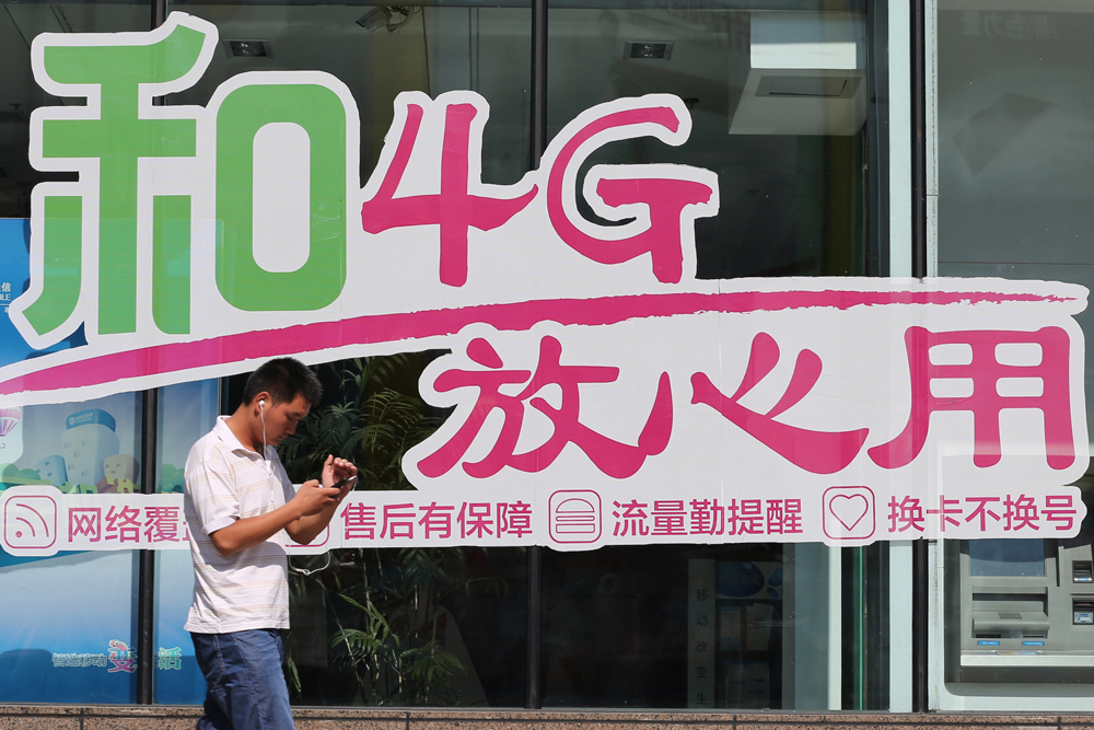 圖:電信和聯通已在16個城市開展4G測試。圖為山西民眾從4G廣告標語前經過 中新社