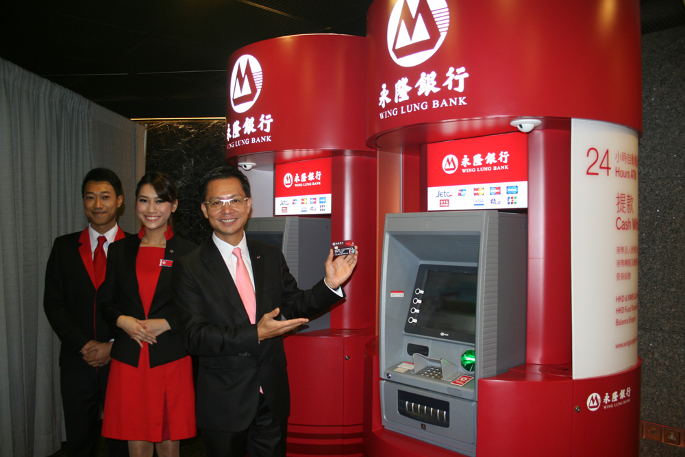 圖:永隆銀行助理總經理鍾少權(右一)昨日介紹全新設計的櫃員機,身後為永隆員工正穿?永隆的全新制服
