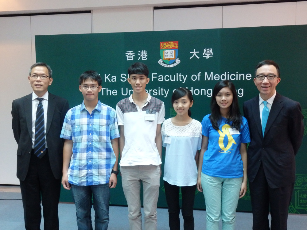 圖:港大醫學院今年共取錄五位7科5**狀元,當中馬國鳴(左二)和麥志鏘(左三)除港大入學獎學金及醫學院院長獎學金外,亦成為首批獲「醫學院飛躍獎學金」的學生 本報記者毛依文攝