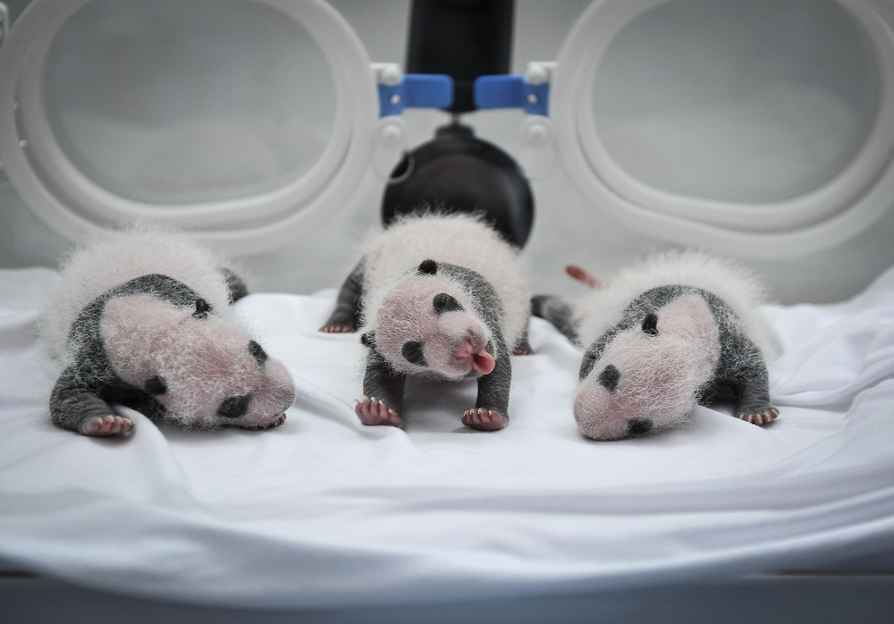 大熊貓媽媽「菊笑」於7月29日誕下三隻熊貓幼仔,這是全球目前唯一存活的大熊貓三胞胎。大熊貓三胞胎的存活率極其低,難度非常大。 (中新社)