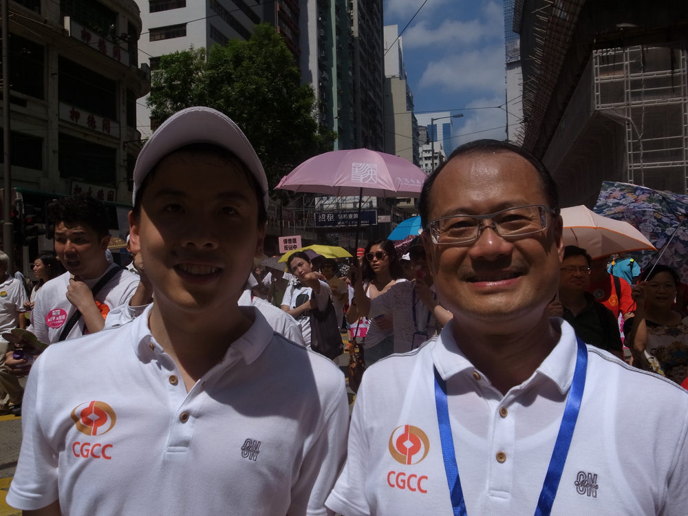 圖:全國政協教科文衛體副主任、香港中華總商會永遠名譽會長蔡冠深(右)和兒子蔡雋思參加反佔中遊行 本報記者朱晉科攝