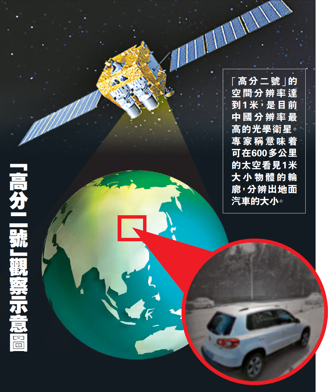 圖:「高分二號」的空間分辨率達到1米,是目前中國分辨率最高的光學衛星。專家稱意味?可在600多公里的太空看見1米大小物體的輪廓,分辨出地面汽車的大小。