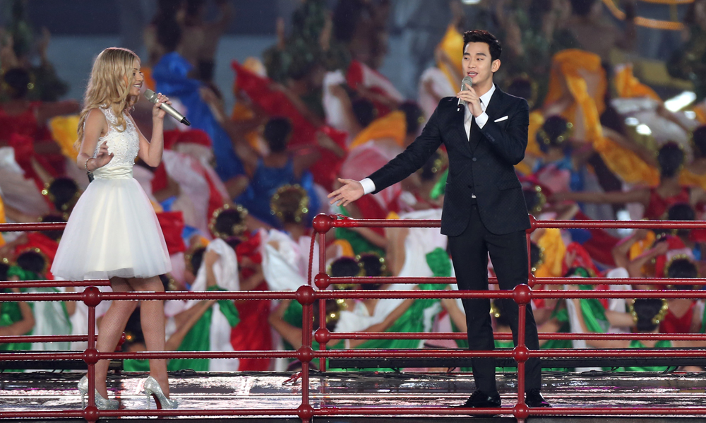 圖:16日晚青奧會,在中國具有極高人氣的「都教授」金秀賢(右)獻唱主題歌《點亮未來》 中新社