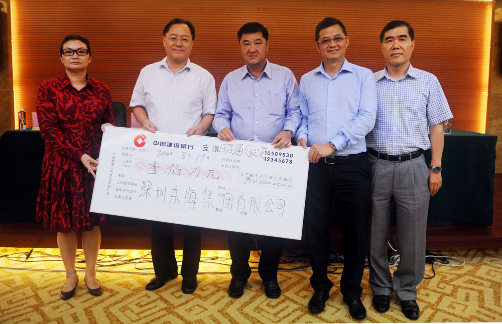 圖:港區全國政協委員、太平紳士東海集團董事長黃楚標(中)代表集團向深圳市民政局黨委書記杜鵬(左二)、深圳市民政局副局長侯伊莎(左)捐獻善款100萬元