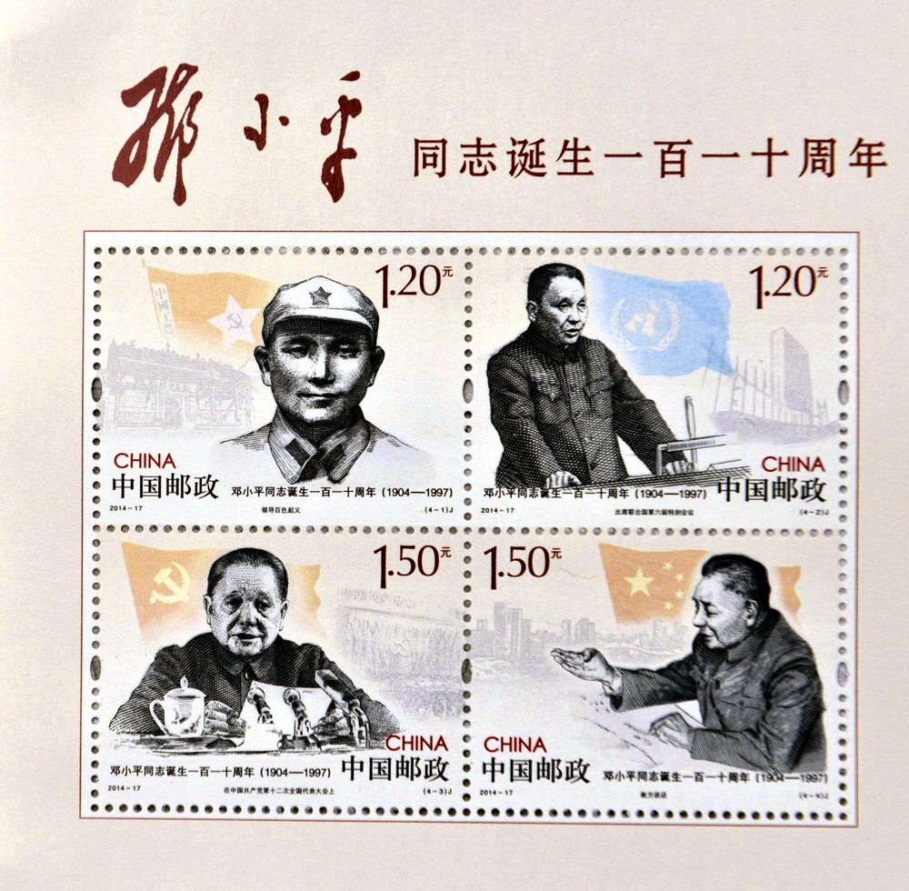 圖:中國郵政22日發行《鄧小平同志誕生一百一十周年》紀念郵票一套4枚,郵票內容分別為「領導百色起義」、「出席聯合國第六屆特別會議」、「在中國共產黨第十二次全國代表大會上」、「南方談話」     新華社