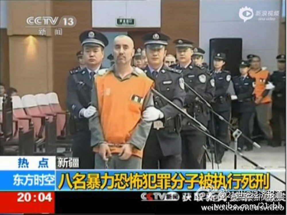 圖:近日,犯有組織、領導、參加恐怖組織罪,故意殺人罪,放火罪,非法製造、儲存、運輸爆炸物罪,以危險方法危害公共安全罪的8名暴恐罪犯被執行死刑  視頻截圖